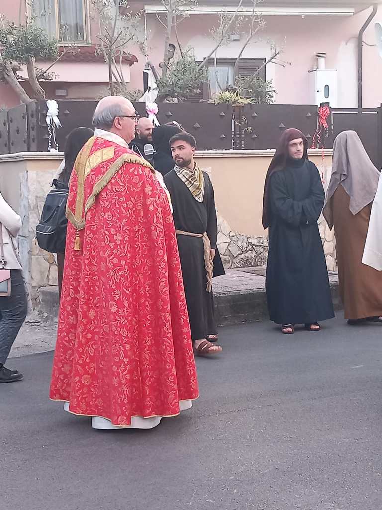 Don Michele Grosso, organizzatore, si rivela subito molto amichevole e spiega così: “E’ dal Medioevo che noi sacerdoti abbiamo dato la libertà ai laici di organizzare questi eventi, per dedicarci alla preghiera. Nel tempo, però, ho visto diventare la rievocazione della Passione una vuota sfilata. Io, che sono qui da cinque anni, ho voluto renderla, invece, un momento di aggregazione comunitaria e di preghiera. Quest’anno, finalmente, abbiamo potuto contare sui vestiti realizzati dalle sarte locali, gli altri anni invece erano prestati o affittati. Tutto si è svolto con collaborazione volontaria. Ho cercato di mantenere la massima fedeltà ai vestiti dell’epoca.”