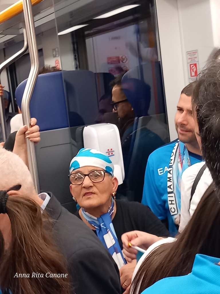 Napoli, 7 maggio. Ore 15:30 circa, in viaggio sulla linea 2 metropolitana da Piazza Cavour a Campi Flegrei. I vagoni si riempiono subito di coloratissimi tifosi del Napoli, maschi e femmine, tutti in maglia azzurra d’ordinanza con ben visibile lo sponsor Lete, maglie con il numero dei giocatori e così via. Una coppia ha messo al cane una pettorina azzurra con la scritta “Di Lorenzo”, in omaggio al difensore e capitano del Napoli. Ci sono famiglie con bambini, adulti, gruppi di amici. E’ una simpatica esperienza da vivere almeno una volta nella vita. Partono subito i cori “Chi non salta è juventino, chi non salta è pisciaiuolo” (frecciata ai tifosi della Salernitana). Si alternano il coro “Siamo noi, siamo noi, i campioni dell’Italia siamo noi” e le strofe delle canzoni “Sarò con te” e “Ho visto Maradona”.