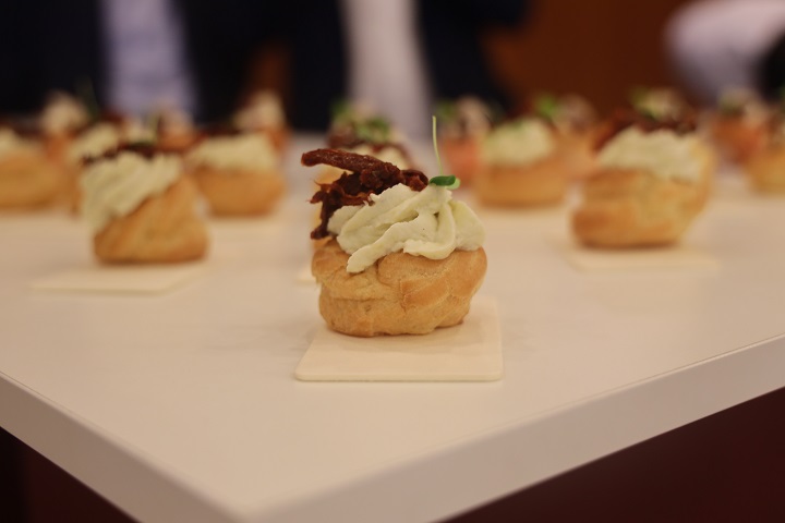Ad aprire ci ha pensato uno starter degno dell’Alta Cucina, firmato dallo chef Peppe Auricchio del Ravida e con l’aiuto, per la parte del lievitato, di Nicola Cesarano di Pomodorì: uno sgombro marinato agli agrumi, con foie gras di baccalà dell’azienda Unifrigo Gadus di Andrea Eminente, su pane cotto al vapore, con dadolata di limone candito, fiori eduli e il tocco finale dell’elisir di scarola riccia e olio EVO. Il tutto accompagnato da un Greco di Tufo.