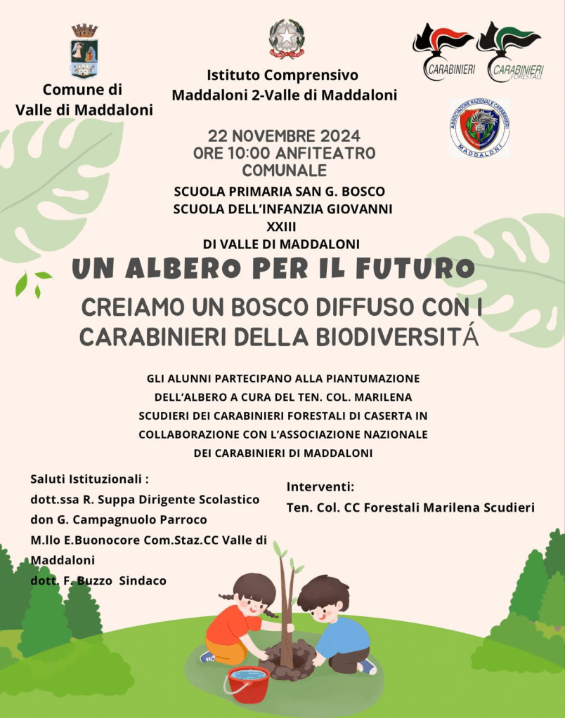 Valle di Maddaloni – La giornata nazionale degli alberi, istituita in Italia dal 2013, è ormai una tradizione consolidate per le scuole. E, il 21 novembre è diventata una vera e propria festa, una giornata attesa per celebrare l’importanza della natura e degli alberi in particolare . In occasione di questa ricorrenza venerdì 22 novembre, gli alunni del plesso di scuola primaria “San Giovanni Bosco” dell’I.C. “Maddaloni 2 – Valle di Maddaloni”, si sono resi protagonisti dell’evento, creato grazie alla collaborazione con l’ANC, l’Associazione Nazionale Carabinieri di Maddaloni, con i Carabinieri Forestali di Caserta. E come sempre accade, in questo piccolo ed attivissimo comune, a partecipare all’iniziativa con docenti, alunni, soci dell’ANC e i Carabinieri Forestali, la dirigente Rosa Suppa, il sindaco Francesco Buzzo, il parroco don Giuseppe Campagnuolo e il comandante della locale stazione il maresciallo Buonocore. Ospite d’eccezione, il Tenente Colonnello Marilena Scudieri dei Carabinieri Forestali di Caserta.