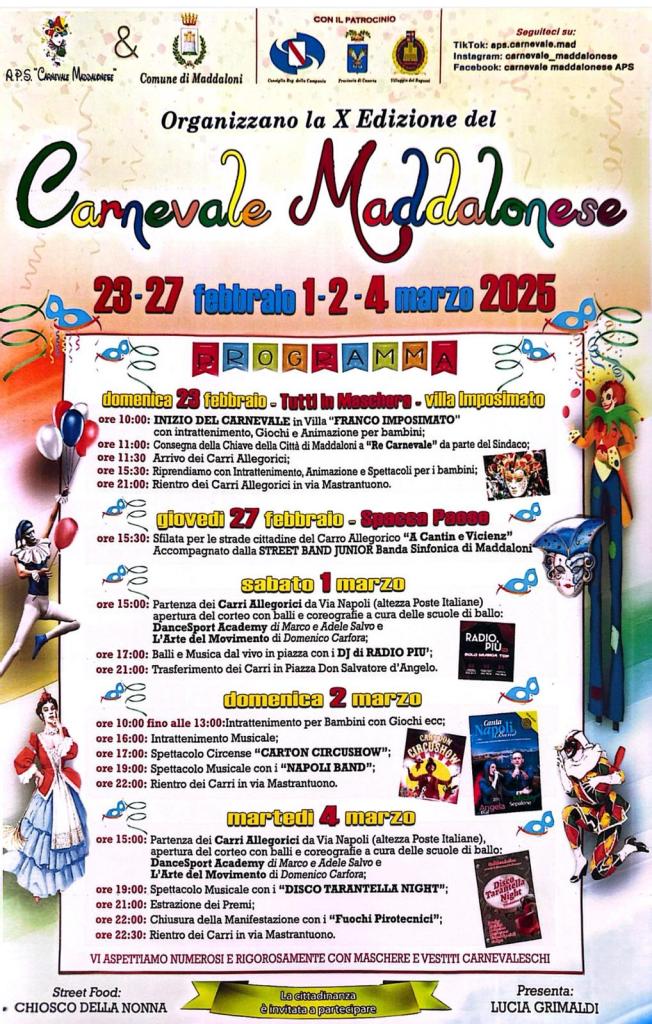 Maddaloni – Conto alla rovescia per il Carnevale maddalonese. Un’edizione speciale quella di quest’anno. L’evento infatti, inserito nel calendario dei Carnevali d’Italia, festeggia dieci anni di impegno e passione da parte dall’associazione APS “Carnevale maddalonese” che ha fatto crescere l’iniziativa nel corso di questi anni, riportando in città i vecchi fasti e la tradizione della festa più allegra e colorata che c’è.