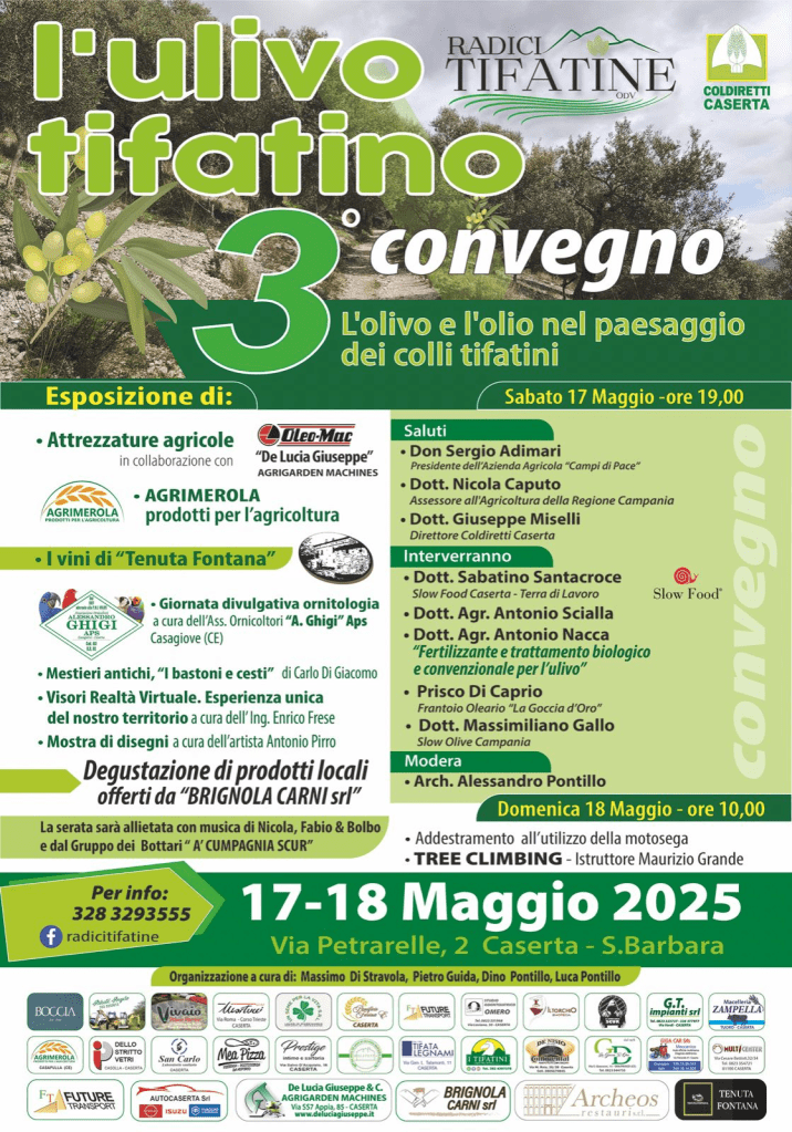 Sabato 17 maggio alle ore 19.00 si terrà il convegno moderato dall’arch. Alessandro Pontillo in cui saranno relatori rappresentanti di Slow Food e Slow Olive dott. Sabatino Santacroce e Massimiliano Gallo, gli agronomi Antonio Nacca e Antonio Scialla e Prisco Di Caprio titolare del frantoio “ La goccia d’oro”. A portare i saluti istituzionali introduttivi l’assessore all’agricoltura Nicola Caputo. Presente la COLDIRETTI con il presidente di Caserta Giuseppe Miselli e don Sergio Adimari presidente dell’azienda agricola “Campi di pace”.
