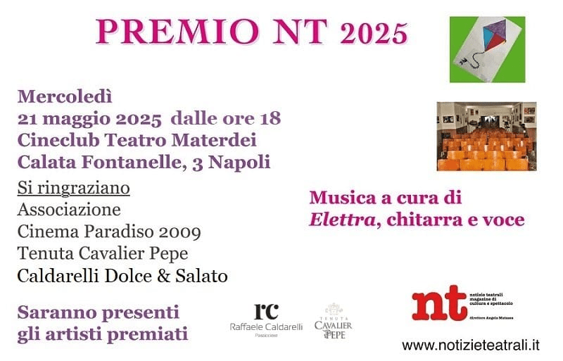 Si svolgerà mercoledì 21 maggio 2025, alle ore 18, presso il Cinema Materdei di Napoli, la premiazione dei giovani talenti dello spettacolo. L’antica sala, messa a disposizione dall’Associazione Cinema Paradiso 2009, ospiterà l’iniziativa Premio NT 2025, promossa dalla testata giornalistica webmagazine http://www.notizieteatrali.it, diretta da Angela Matassa. Un piccolo aquilone colorato in ceramica, disegnato dal giovanissimo Luca Enzo Esente, sarà l’oggetto donato ai premiati. La giuria, composta dalla redazione del magazine, ha scelto tre noti rappresentanti della scena, del set, della televisione, rispettivamente nelle seguenti categorie: attrice, attore, regista cinematografico.