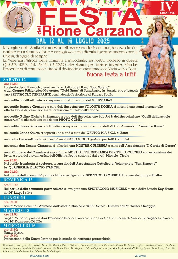 Molto bello il messaggio del sacerdote, don Raffaele D’Agosto, stampato sul programma: “La Vergine della Sanità ci è maestra nell’essere credenti con una pienezza che è il risultato di un sì umano, forte e coraggioso e che diventa il grembo materno per la Chiesa, di oggi e di sempre. La Venerata Patrona della comunità parrocchiale sia nostro modello in questa QUARTA FESTA DEL RIONE CARZANO che stiamo per iniziare insieme, affinché l’esperienza di comunione rinnovi il desiderio di camminare con Maria verso Gesù“.