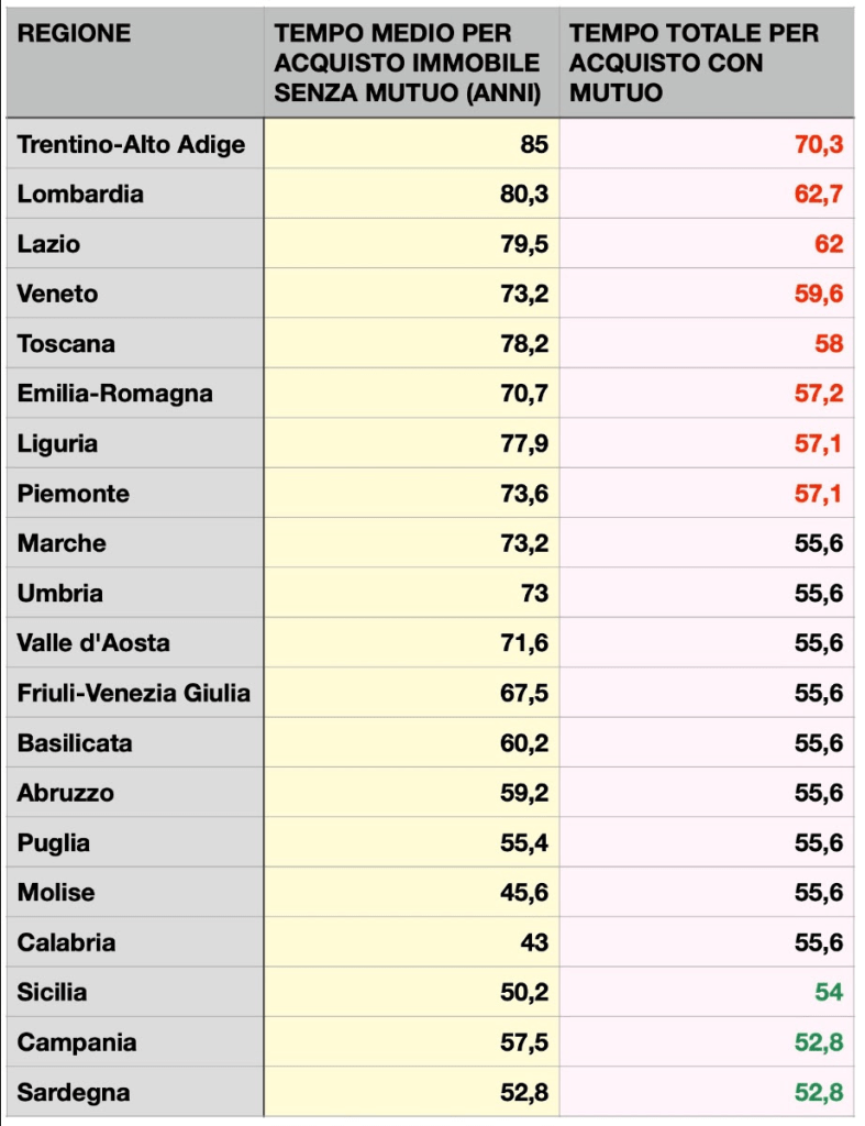 Senza l’aiuto della famiglia, a livello nazionale, il tempo medio necessario ad accumulare un anticipo adeguato per accedere ad un prestito ipotecario sommato al tempo per estinguere un mutuo trentennale è pari a 57,4 anni. Con tempi molto lunghi anche nelle città dove i prezzi degli immobili sono più accessibili, come ad esempio a Crotone (37,3 anni senza mutuo) oppure ad Agrigento, Enna o Caltanissetta dove il tempo necessario è pari a 38,1 anni.