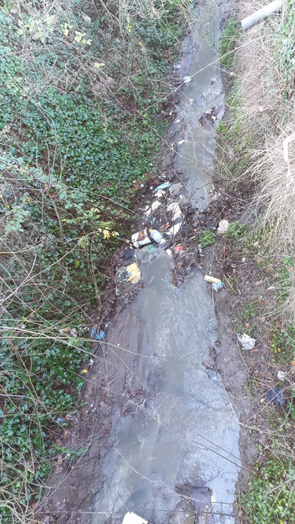 Nei canali scorre acqua di cui non si conosce la provenienza: peggio ancora, potrebbe essere lo sversamento abusivo di qualche cittadino balordo; il dubbio nasce dalla presenza di numerosi contenitori di detersivi.