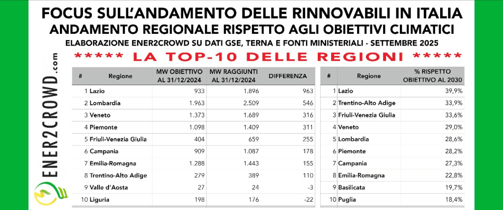 Tra le regioni più virtuose rispetto agli obiettivi del Decreto Aree Idonee troviamo: Lazio (+963 MW oltre il target), Lombardia (+546 MW), Veneto (+316 MW), Piemonte (+311 MW), Friuli-Venezia Giulia (+255 MW), Campania (+178 MW), Emilia-Romagna (+155 MW) e Trentino-Alto Adige (+110 MW).
