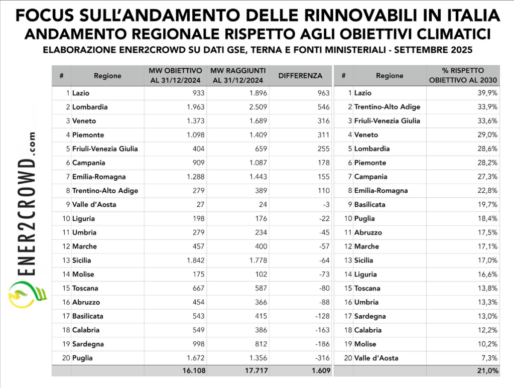 Tra quelle più indietro, troviamo —in ordine di gap— Puglia (-316 MW), Sardegna (-186 MW) e Calabria (-163 MW). «Ma in queste regioni le distanze possono essere facilmente recuperabili con uno o pochi impianti a fonti rinnovabili» commentano gli analisti di Ener2Crowd.