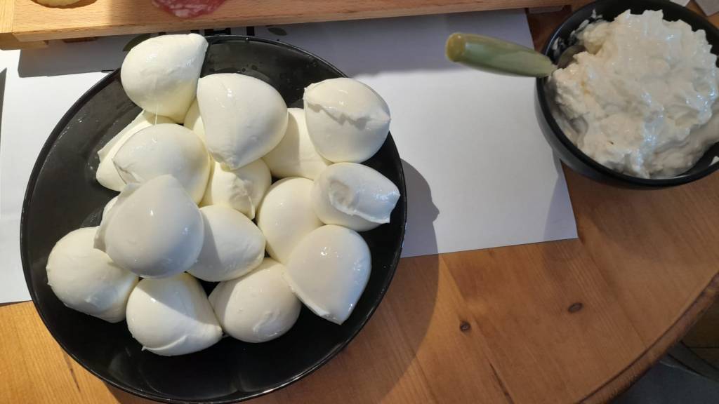 Accanto a essa, la Ricotta di Bufala nasce dal siero residuo della lavorazione, riscaldato lentamente per preservarne le proteine nobili. È raccolta a mano e sgocciolata naturalmente, con una texture cremosa e un gusto pieno e delicato.
