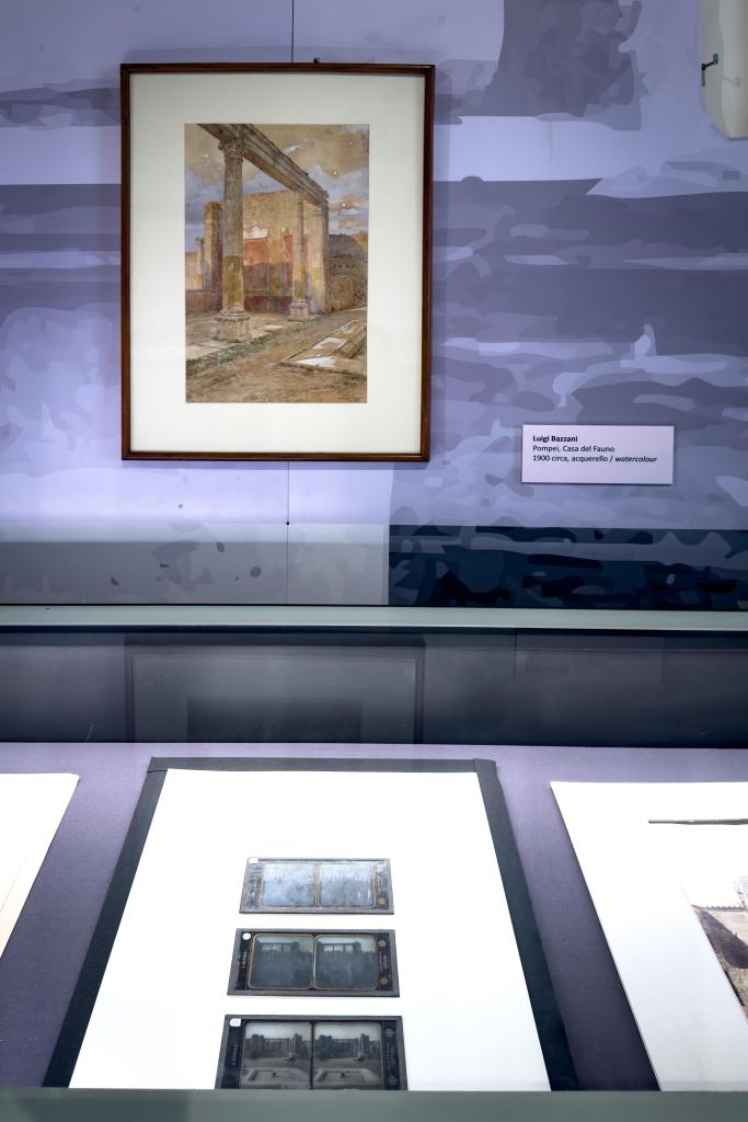 Considerate non soltanto espressioni artistiche, ma anche testimonianze storiche delle scoperte archeologiche nelle città vesuviane, le opere di Bazzani del MANN raffigurano diversi soggetti pompeiani: dal Foro al Tempio di Iside, fino agli interni delle case e ai giardini. Oltre agli acquerelli, sono in mostra una gouache di Giuseppe Marsigli, disegni di Pasquale Maria Veneri, fotografie antiche e bronzi ottocenteschi.