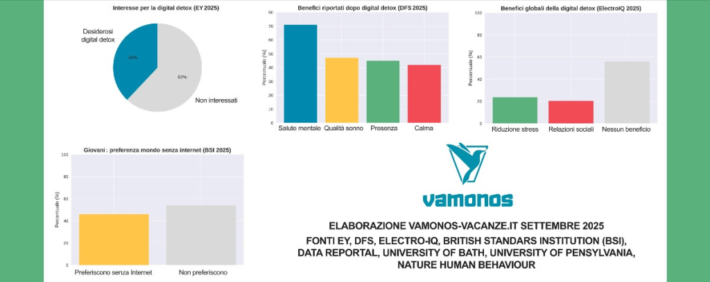 Poi ancora, Vamonos Vacanzesi fa portavoce di una ricerca a più ampio raggio realizzata da Electro IQ, una piattaforma online che dal 2010 è un punto di riferimento per statistiche, dati e analisi relative ai settori della scienza e della tecnologia a livello globale. Questa ricerca rileva che il 23,7% delle persone —dopo una “digital detox”— sperimenta una riduzione di stress e ansia e che il 20,3% migliora anche le sue relazioni sociali.