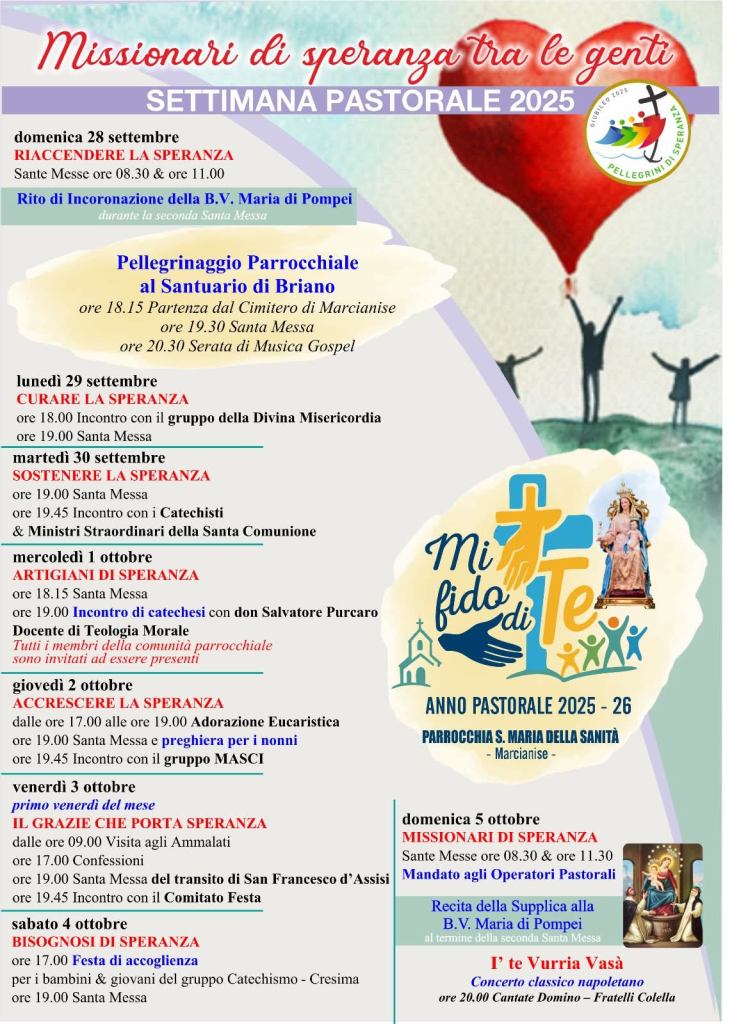 “La Settimana Pastorale Parrocchiale, che riprende la tematica dell’ottobre missionario di quest’anno 2025, si pone in piena sintonia con il grande Giubileo ordinario dedicato al tema della Speranza. Nella Bolla di indizione di questo Anno Santo, Papa Francesco auspicava: «Possa la luce della speranza cristiana raggiungere ogni persona, come messaggio dell’amore di Dio rivolto a tutti! E possa la Chiesa essere testimone fedele di questo annuncio in ogni parte del mondo!» (Bolla Spes non confundit, 6).